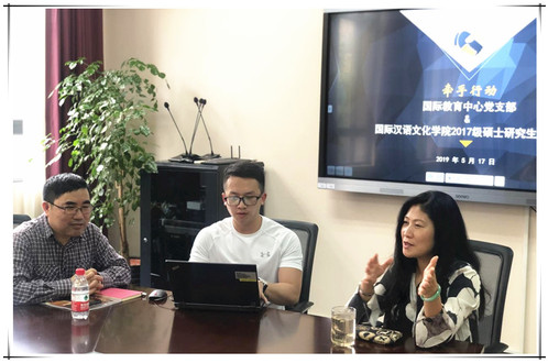 2019年5月17日下午三点,国际教育中心党支部牵手美女直播 2017级硕士生党支部举办了一场别具特色的组织生活分享会。国际教育中心主任兼党支部书记黄美旭与美女直播 党委副书记兼副院长王志,以及来自两个支部的党员师生们共同出席了本次会议。